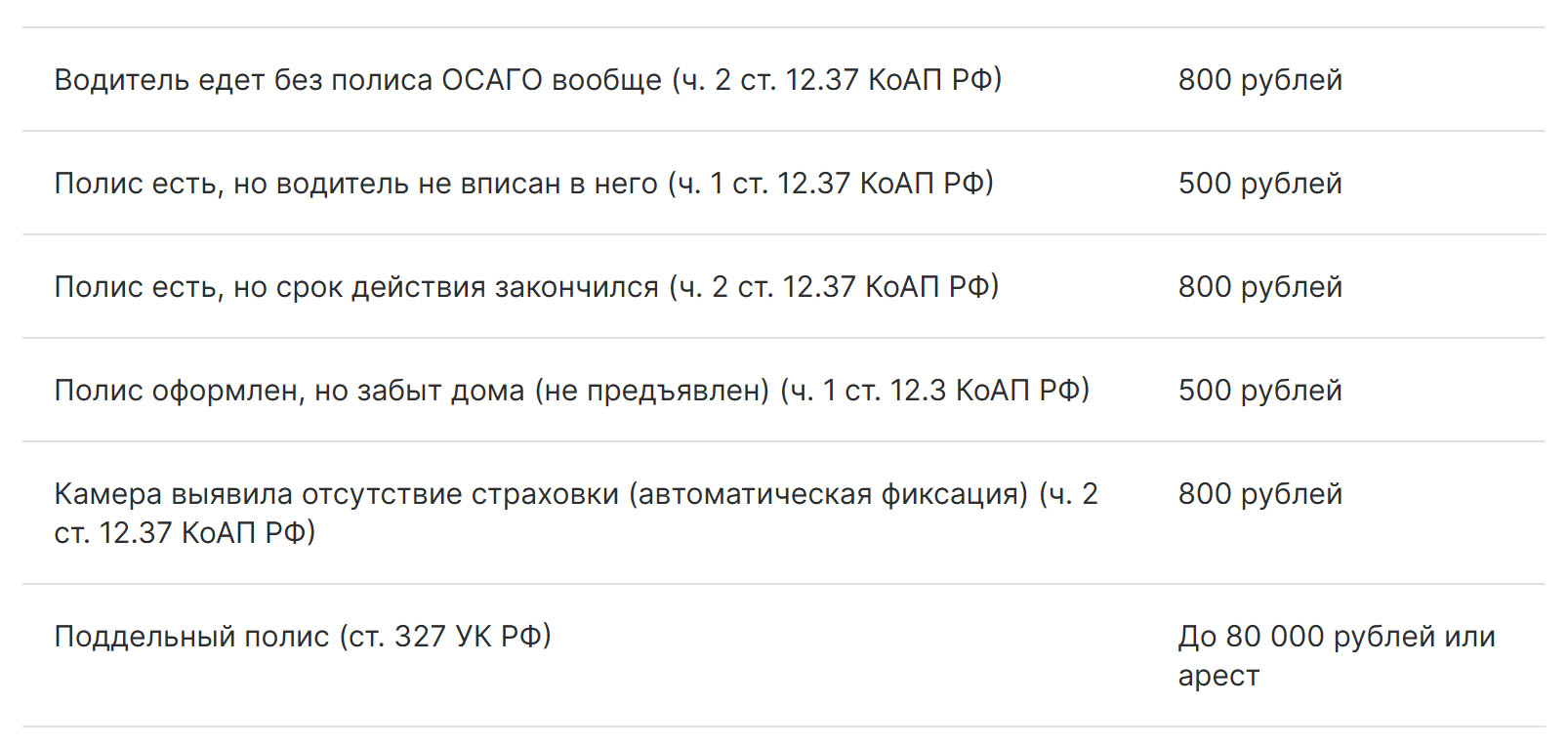 Чтобы не запутаться в суммах, полезно взглянуть на таблицу. В ней собраны основные ситуации, когда могут выписать штраф, и указаны размеры санкций.