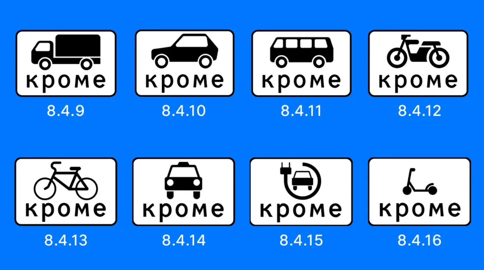 - Пояснительная табличка 8.4.9 - 8.4.16. «Кроме вида транспортного средства», установленная под знаком, ограничивает въезд всем видам транспорта, кроме указанного.